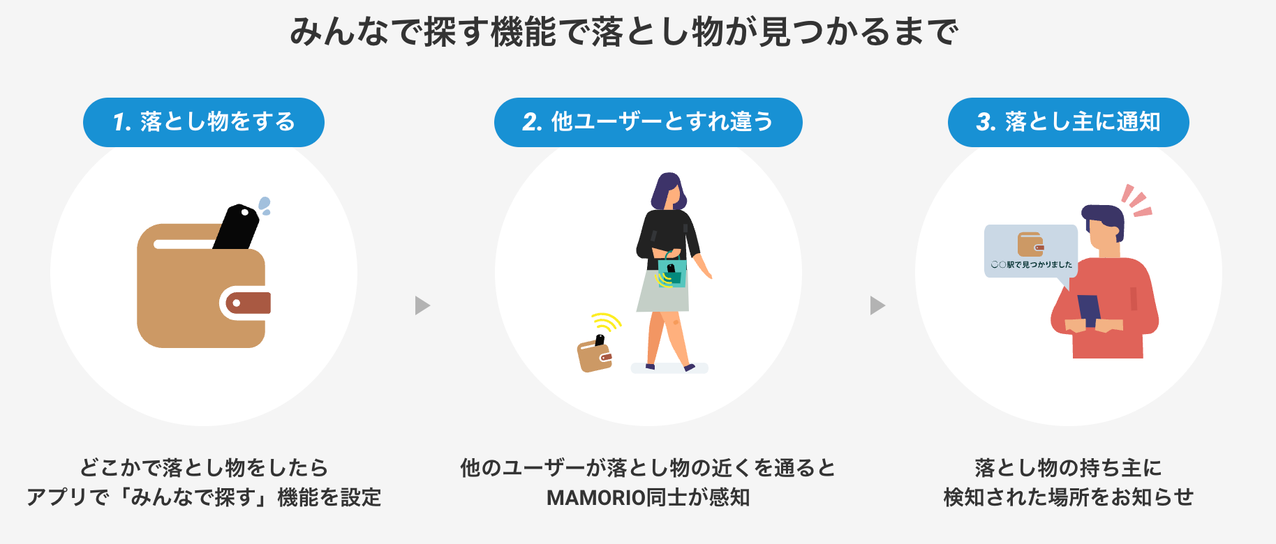 「みんなで探す」を利用すると、紛失されたMAMORIOにお客様以外のMAMORIOユーザーが接近した際やすれ違った際、