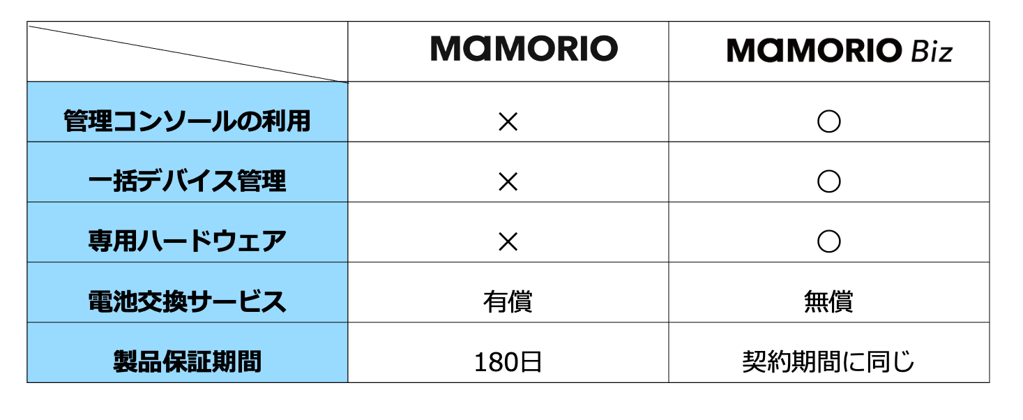 本ページにては、一般向けのMAMORIOと、法人向けのMAMORIO Biz の違いに関してのご説明ページとなります。